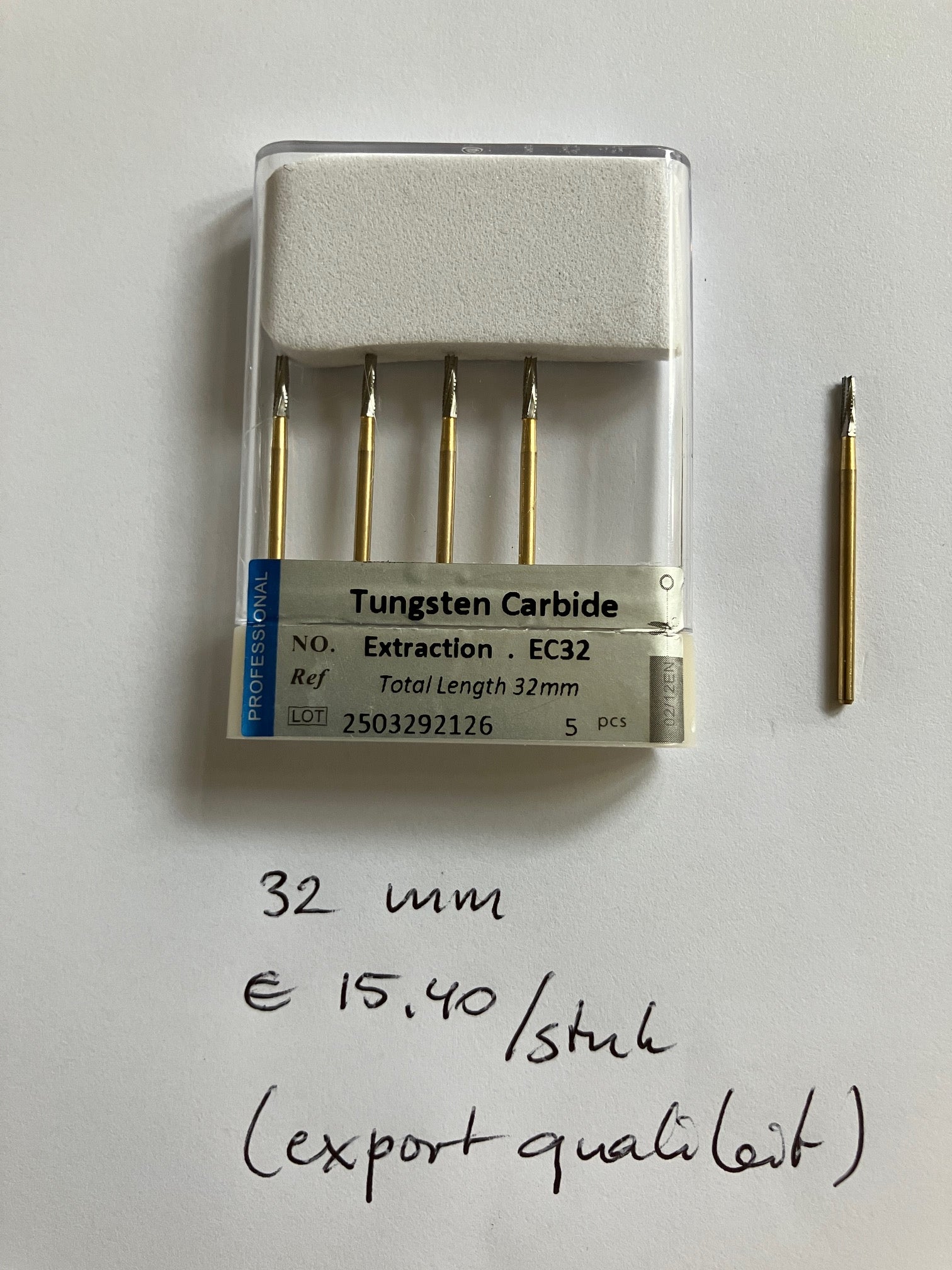 Deze high speed boortjes importeer ik zelf en kan ze daarom tegen redelijk scherpe prijzen aanbieden. Deze verlengde boortjes worden vooral voor Paard gebruikt maar enkelen gebruiken ze ook bij de extractie bij honden. Het betreft hier de export kwaliteit, uitgevoerd in Tungsten Carbide.