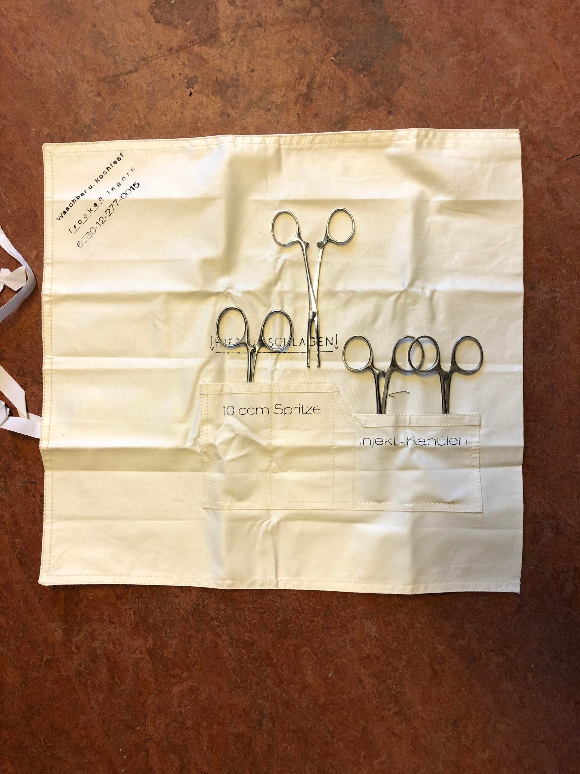 Een partij van deze sterilisatie doeken of enveloppes die vroeger veel gebruikt werden voor het steriliseren van herbruikbare spuiten en ander klein instrumentarium. Ze zijn per stuk gesealed in plastic en dus nooit gebruikt. Ze komen van de Duitse landmacht dus het opschrift is Duits.