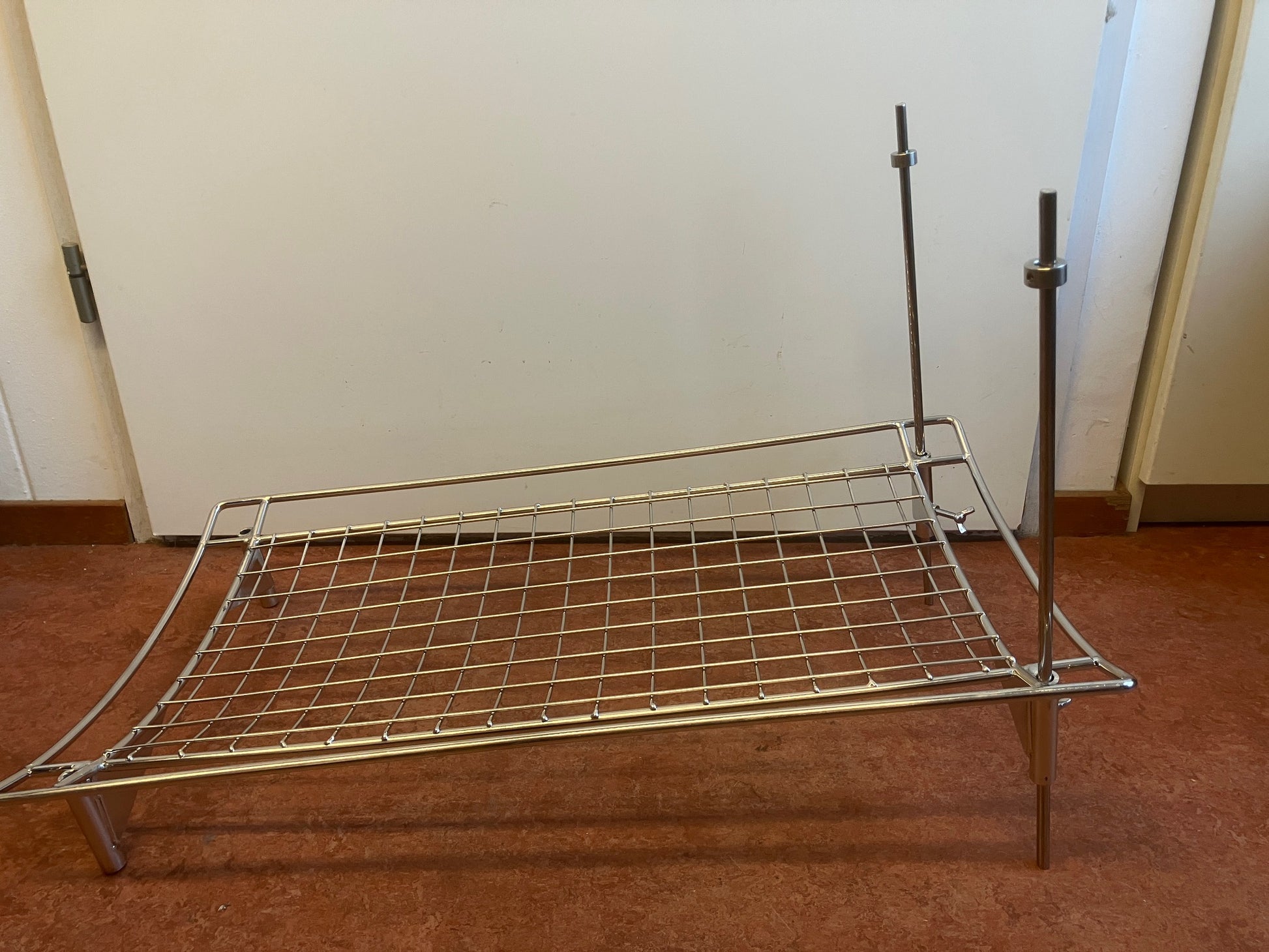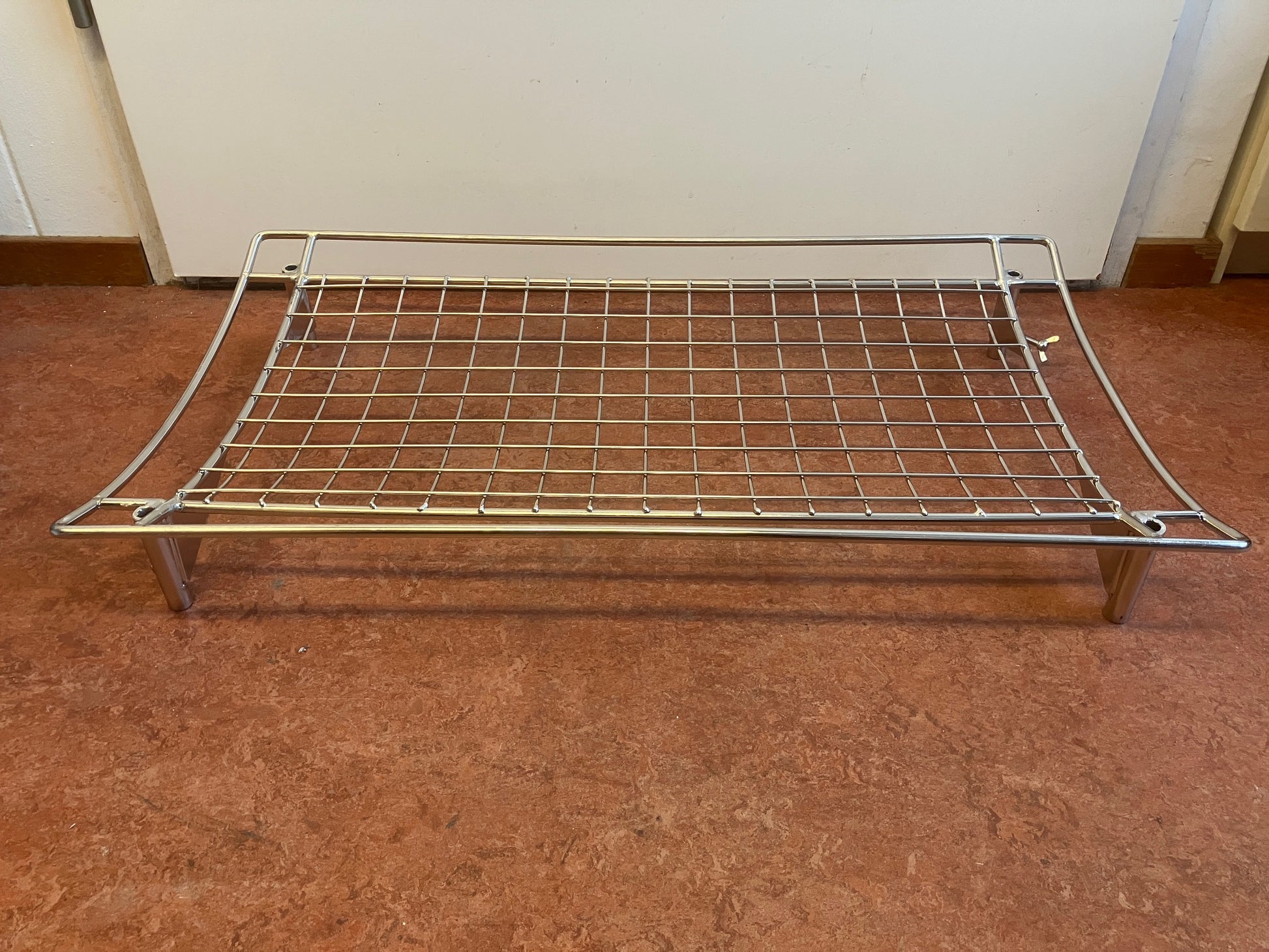 Ik heb deze rekjes van RVS laten maken in plaats van gecoat staal. Zeker een stuk duurder maar veel sterker en geen akelige roestplekken meer als de coating gaat barsten. De afmetingen zijn 70x40, de hoogte is ongeveer 10 cm.