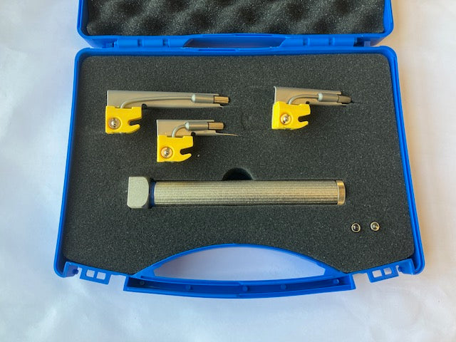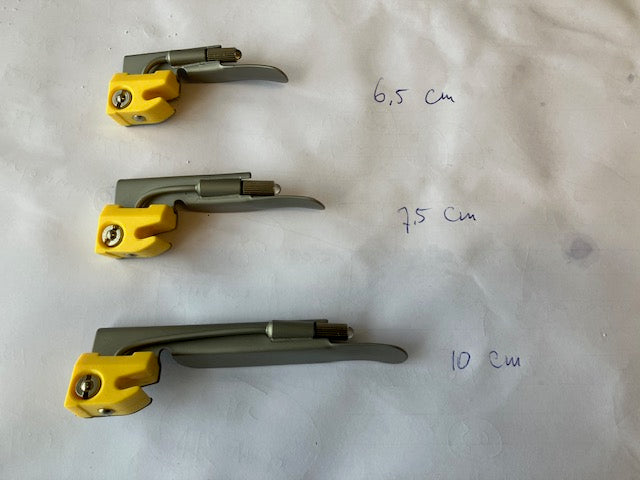 In mijn voortdurende zoektocht naar betaalbare veterinaire spullen nu een aantal laryngoscoop setjes ingekocht met rechte lepels. De maten lopen uiteen van 6,5 naar 10 cm lengte. De breedte is steeds 11 mm.