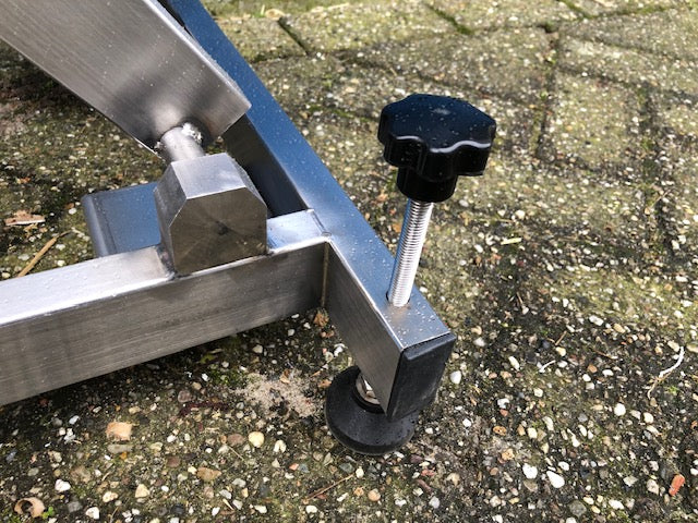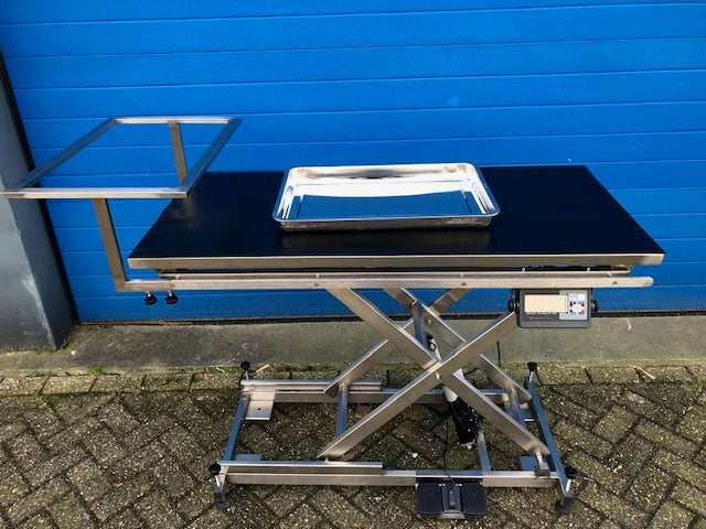 Ik laat in opdracht RVS (304) veterinaire tafels maken. Nu ook een behandeltafel of spreekkamer tafel met een ingebouwde weegoptie. Deze tafels zijn 130x60 en kunnen elektrisch van 29 cm minimaal naar 105 cm maximaal. Een hond kan dus makkelijk zelf op de tafel stappen zonder dat je hem hoeft te tillen. Ik kan voor deze tafels een transparant kunststof mat leveren of een zwart EPDM mat tegen meerprijs. Zwenkwielen zijn ook een optie, let wel op dat dergelijke tafels voor de goede werking van de weegfunctie wel waterpas moeten staat.